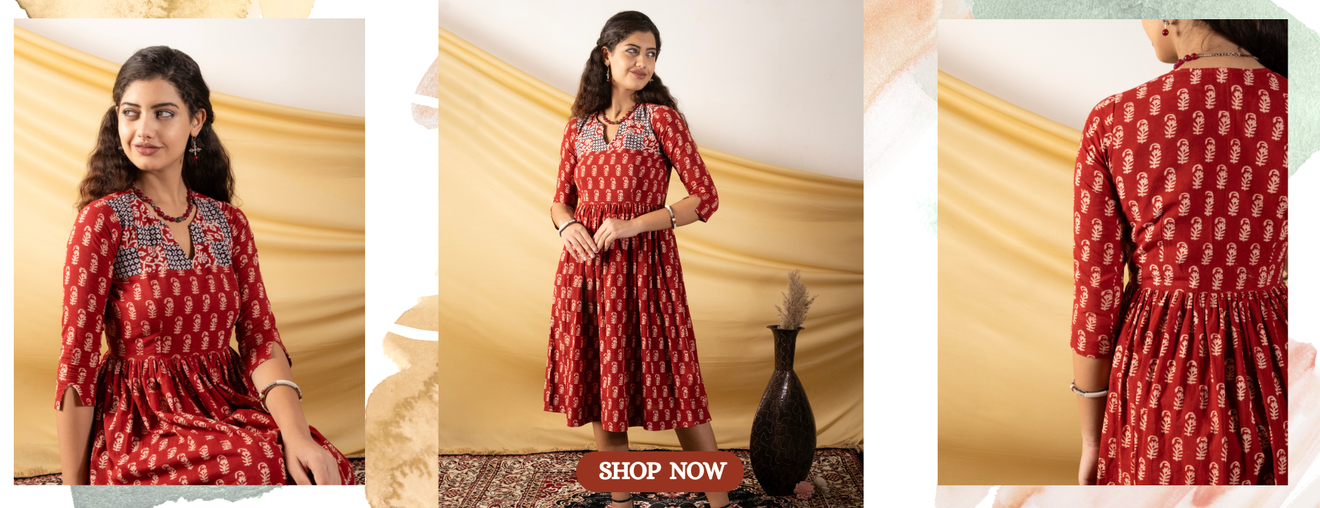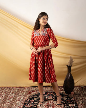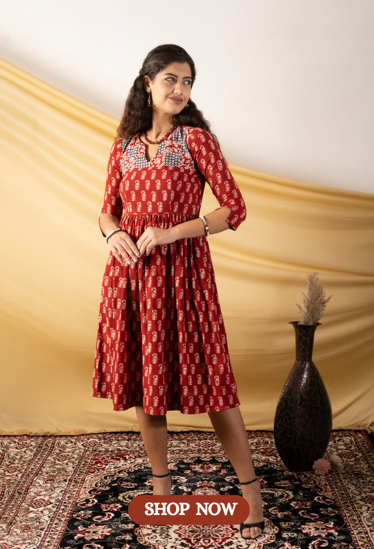 Gulbadan, Bagh Print Angrakha-Inspired Knee-Length Dress with Waist Belt