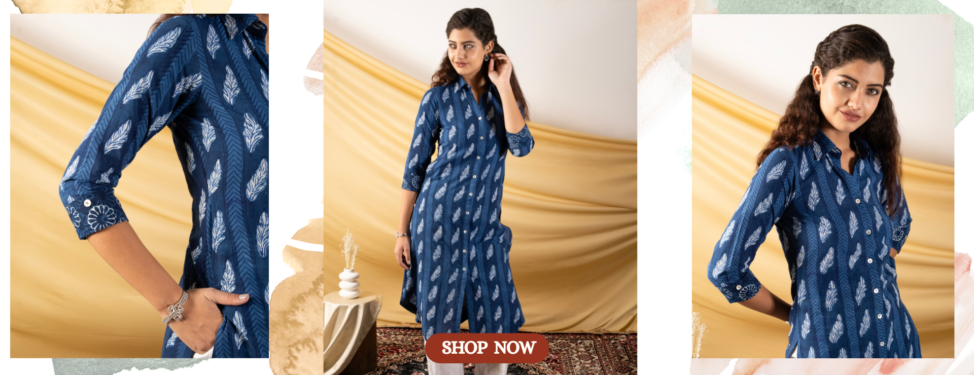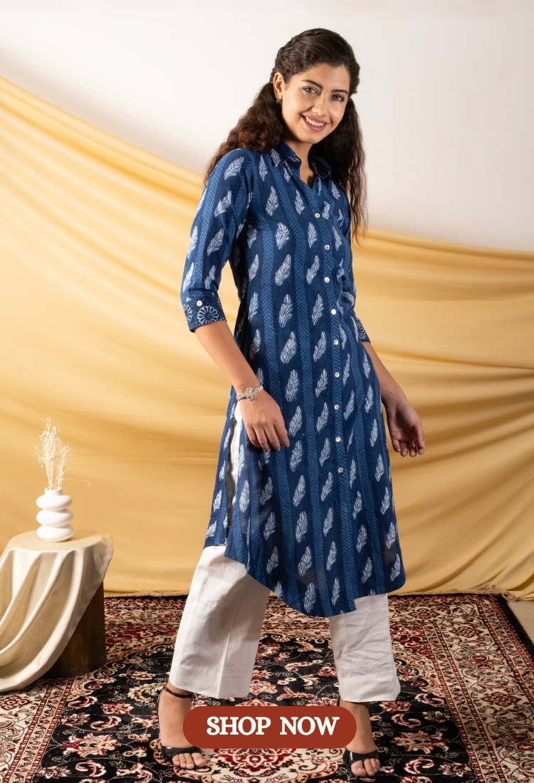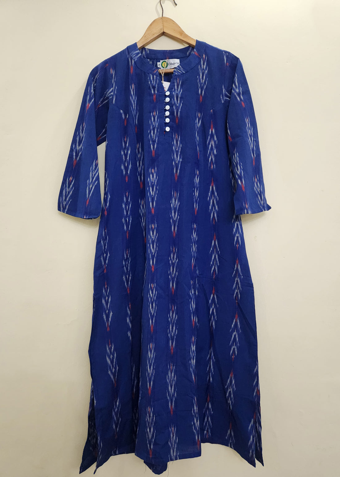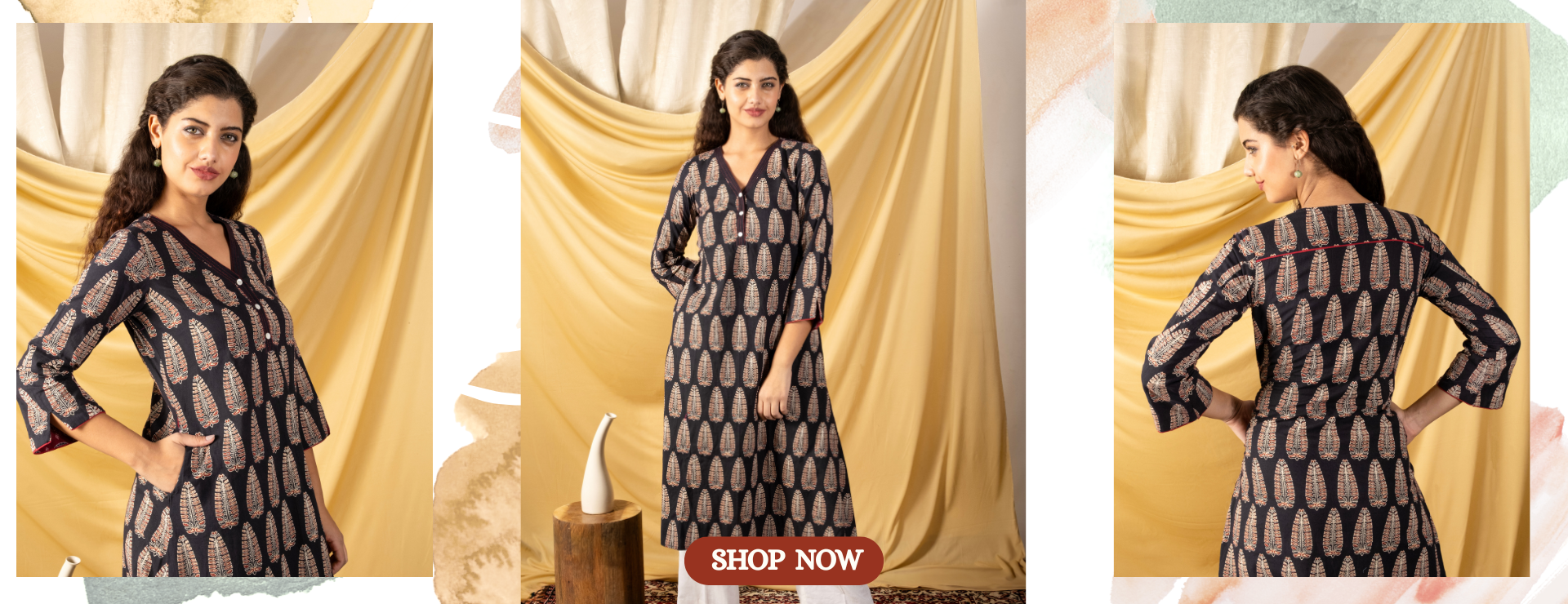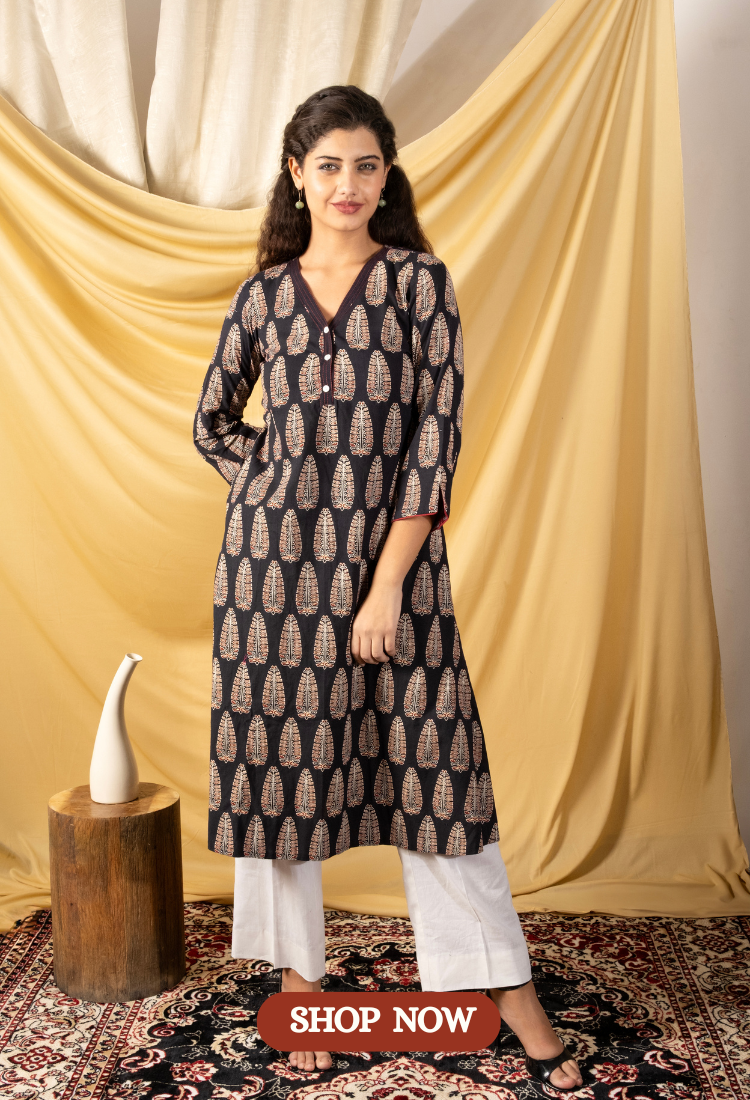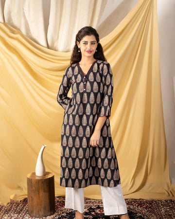 “Pure Cotton Kalamkari Printed Kurta with Wooden Buttons & Side Pockets”