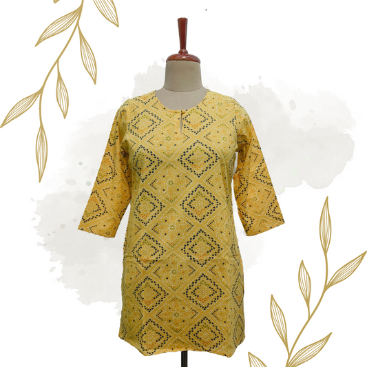 Mustard Kalamkari A-Line Kurta (Both-Side Pockets, Round V Neck)