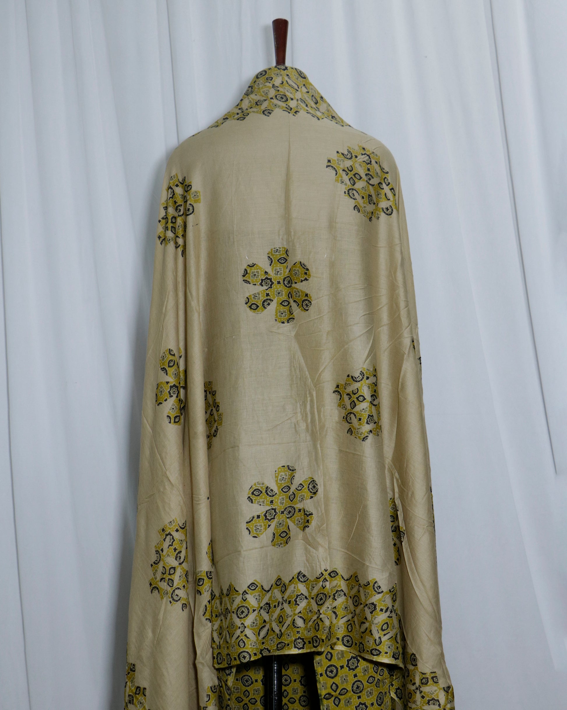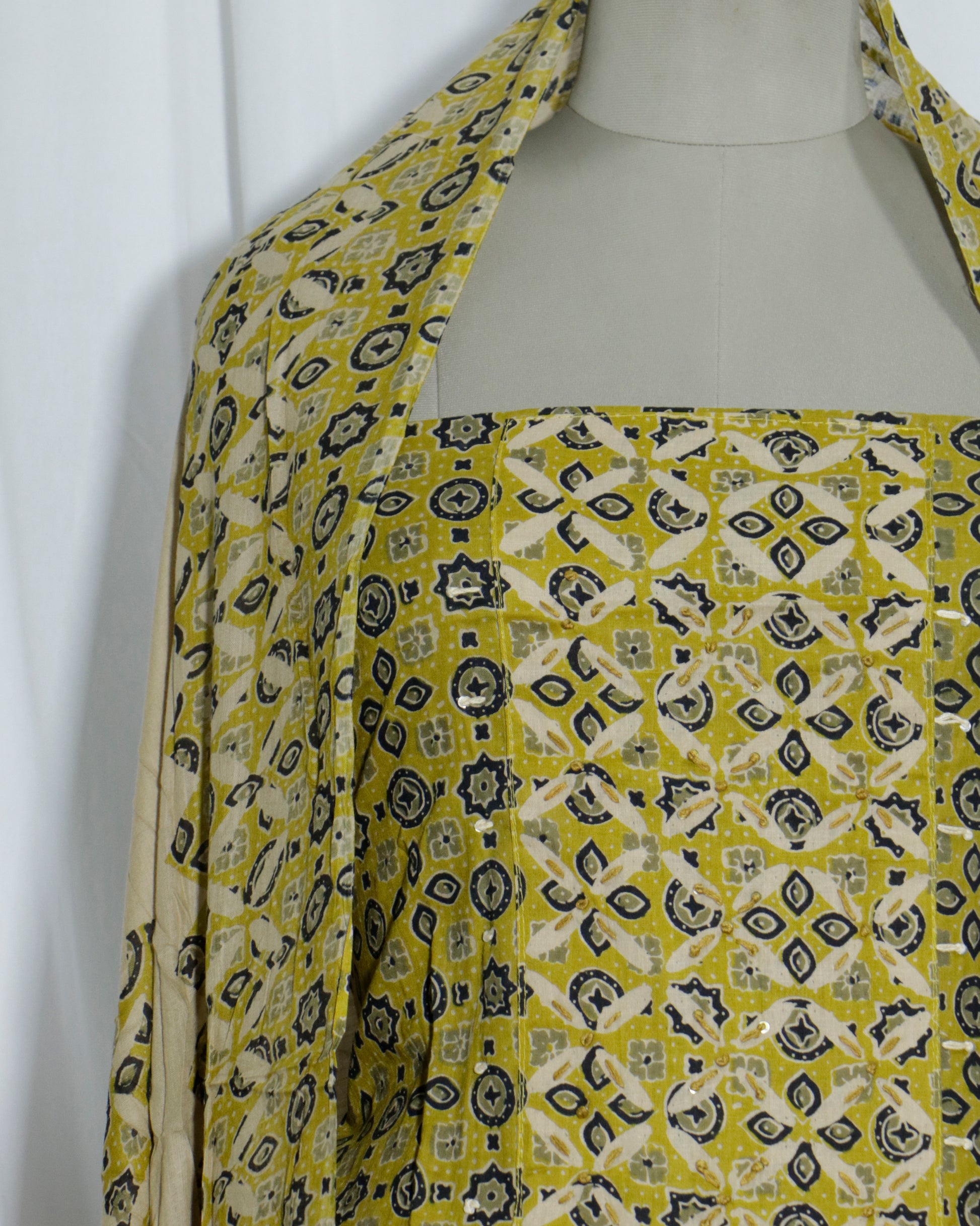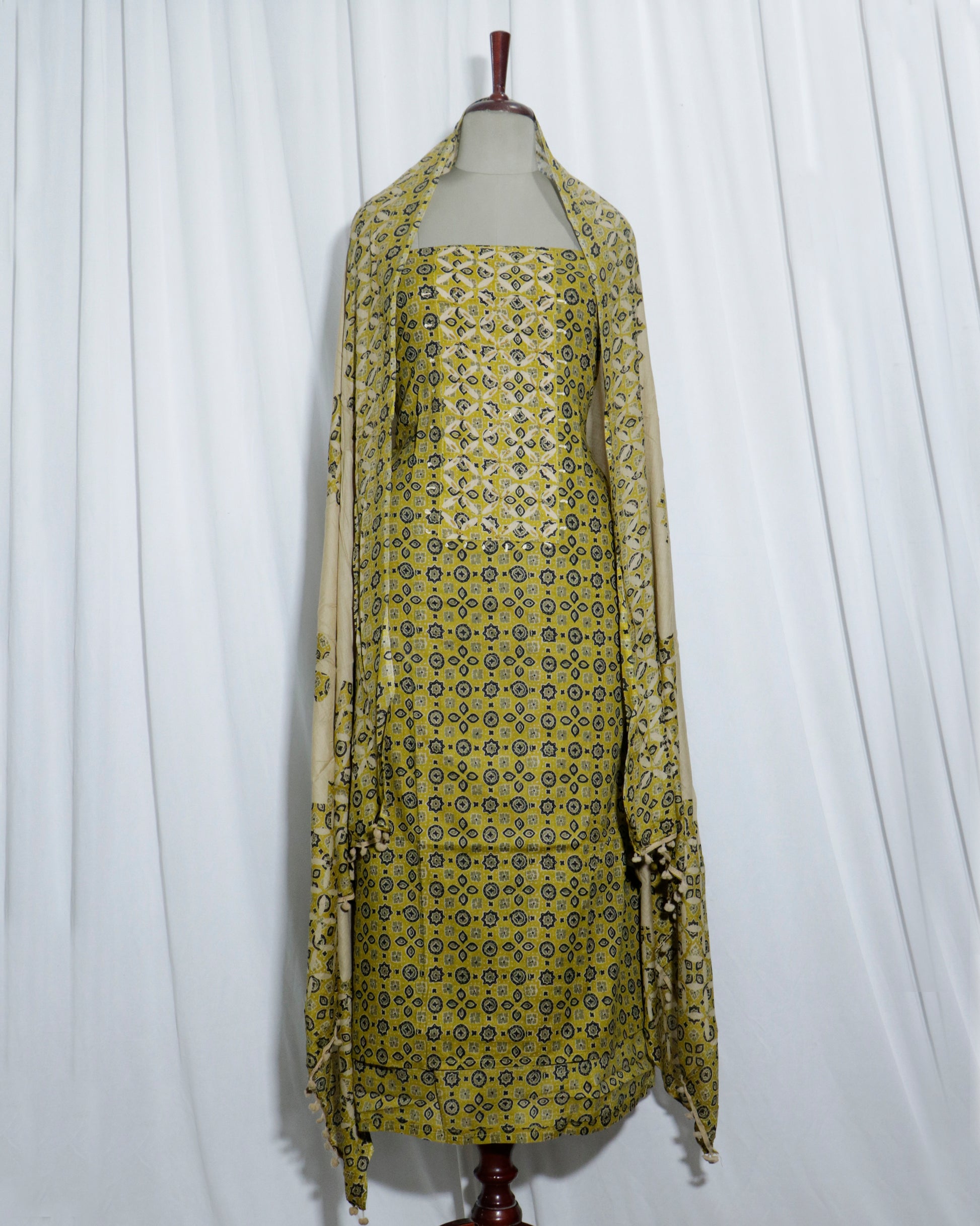Ajrakh applique Printed Mustered Cotton 3 Piece Suit Set with mul-mul dupatta