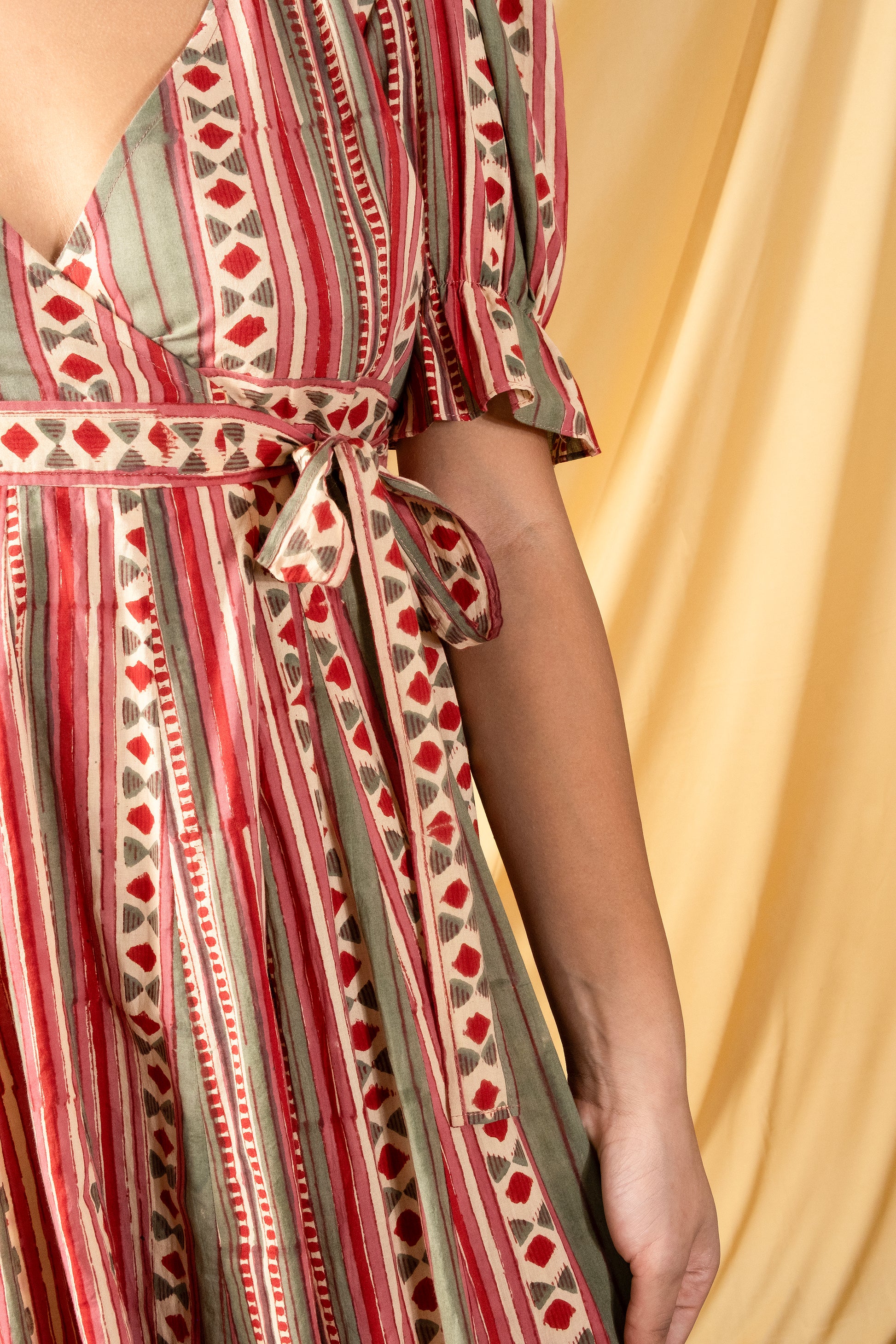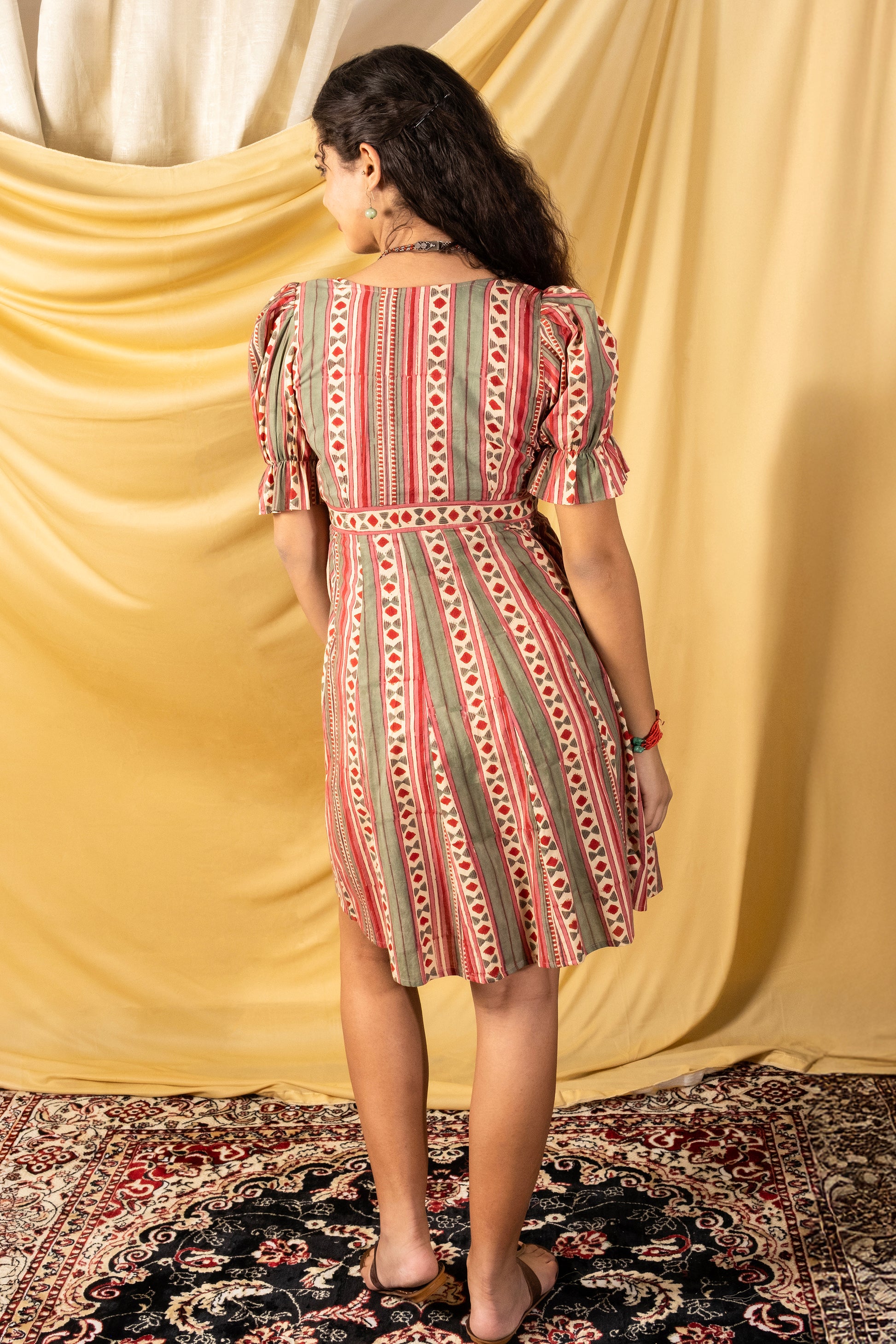 Stay stylish and comfortable in our Ajrakh Print Cotton Dress, designed in a trendy Angarkha style. Made from soft cotton, this knee-length dress is light, breathable, and perfect for all-day wear. The traditional Ajrakh print with earthy tones gives it a touch of elegance, while the tie-up belt and puff sleeves add a modern twist.