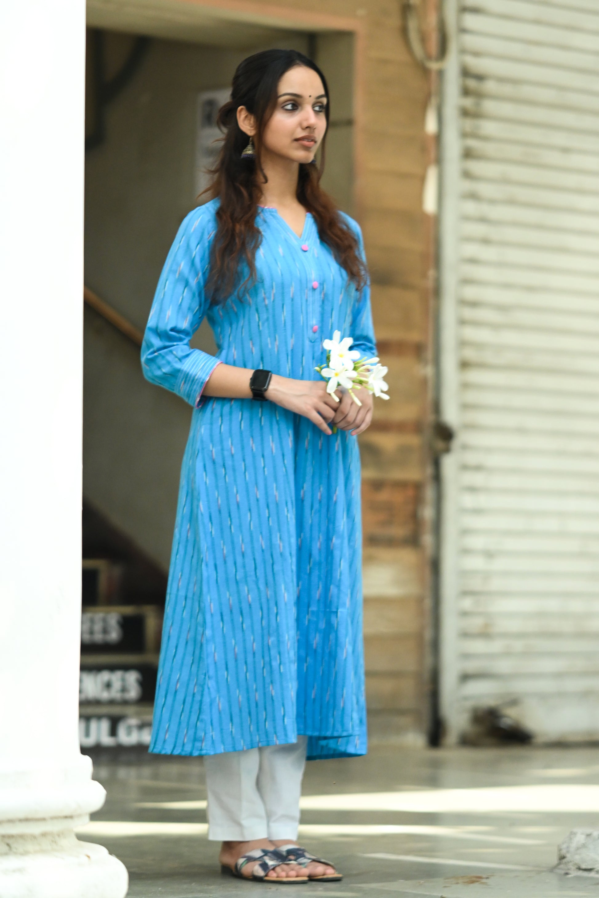 Blue Ikat Handwoven A-Line Cotton Kurta with Thread Work