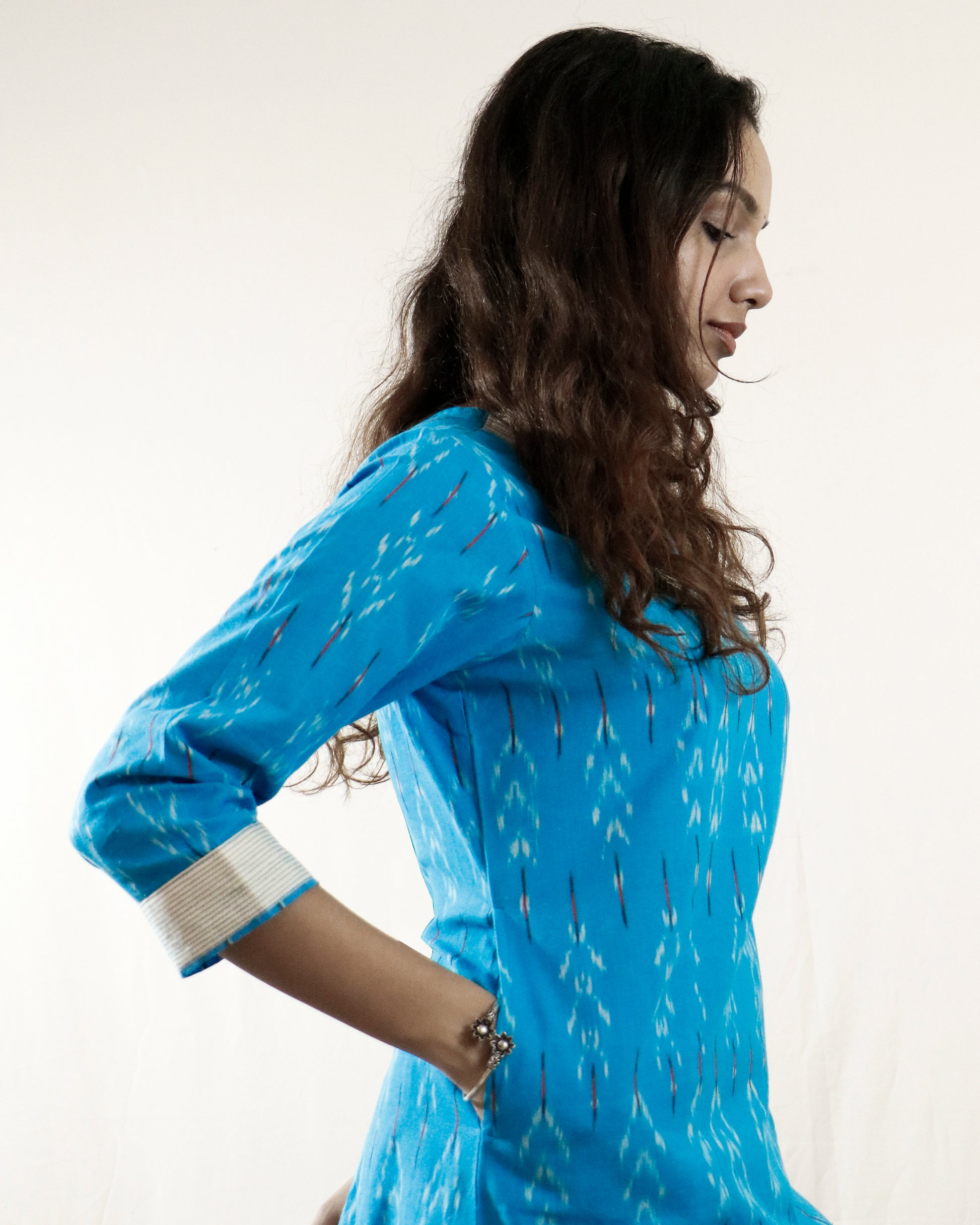 Sky Whisper Ikat Suit Set – Sky blue kurta with cream pant & shaded dupatta (cream-sky)