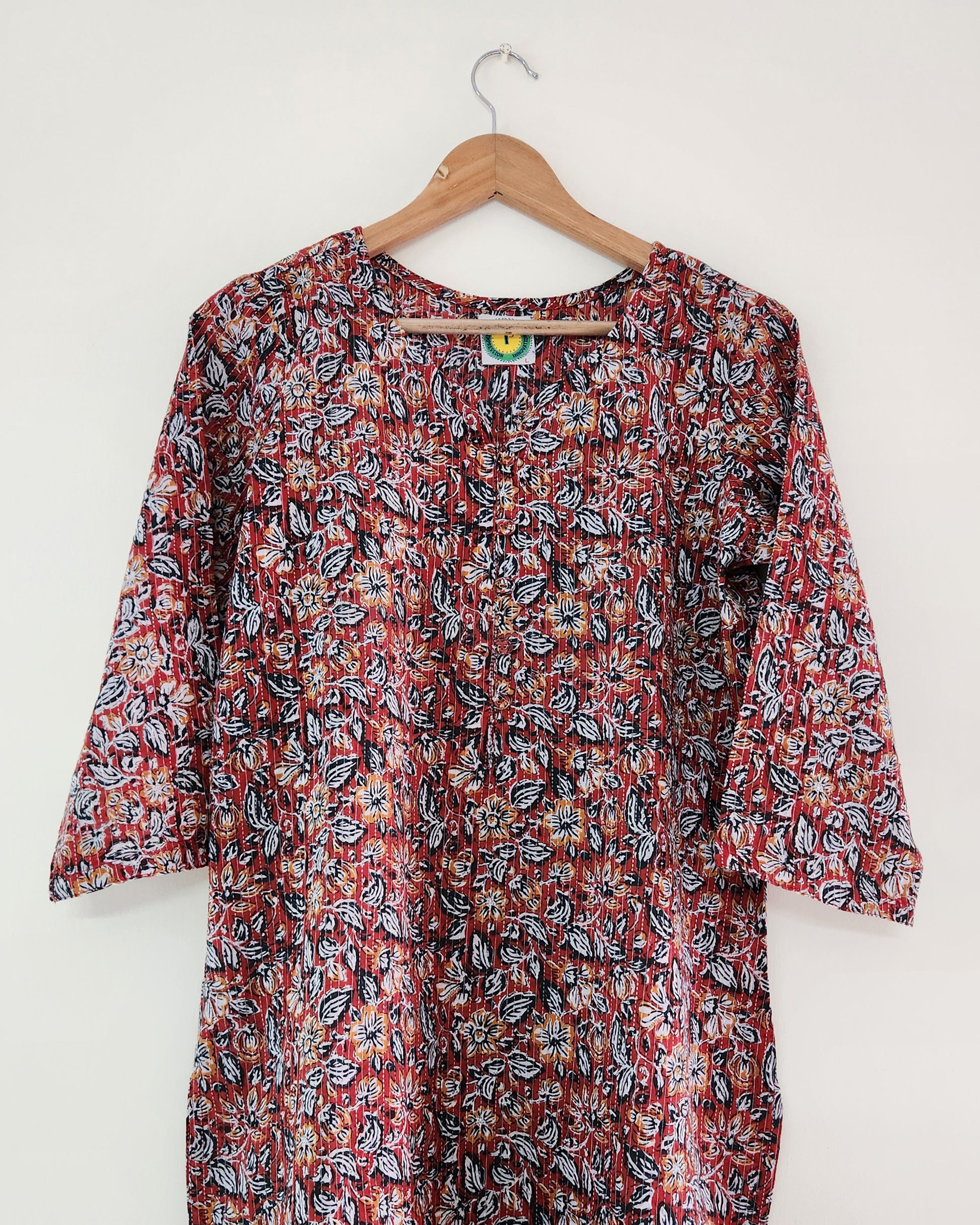 Pink Floral Handblock Printed Cotton Kurta – V Neck, 3/4 Sleeves