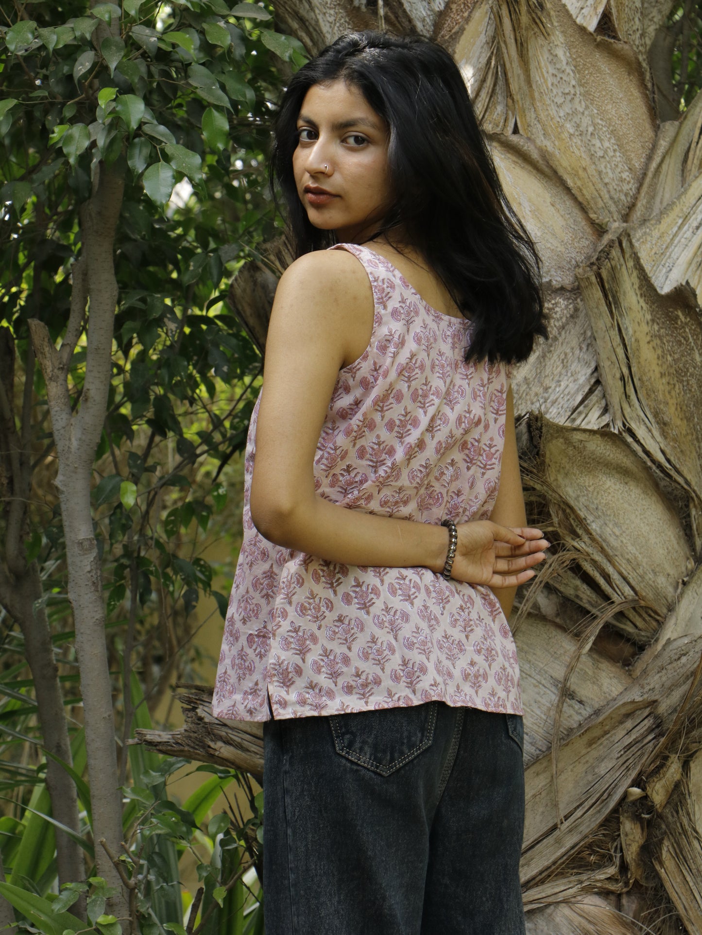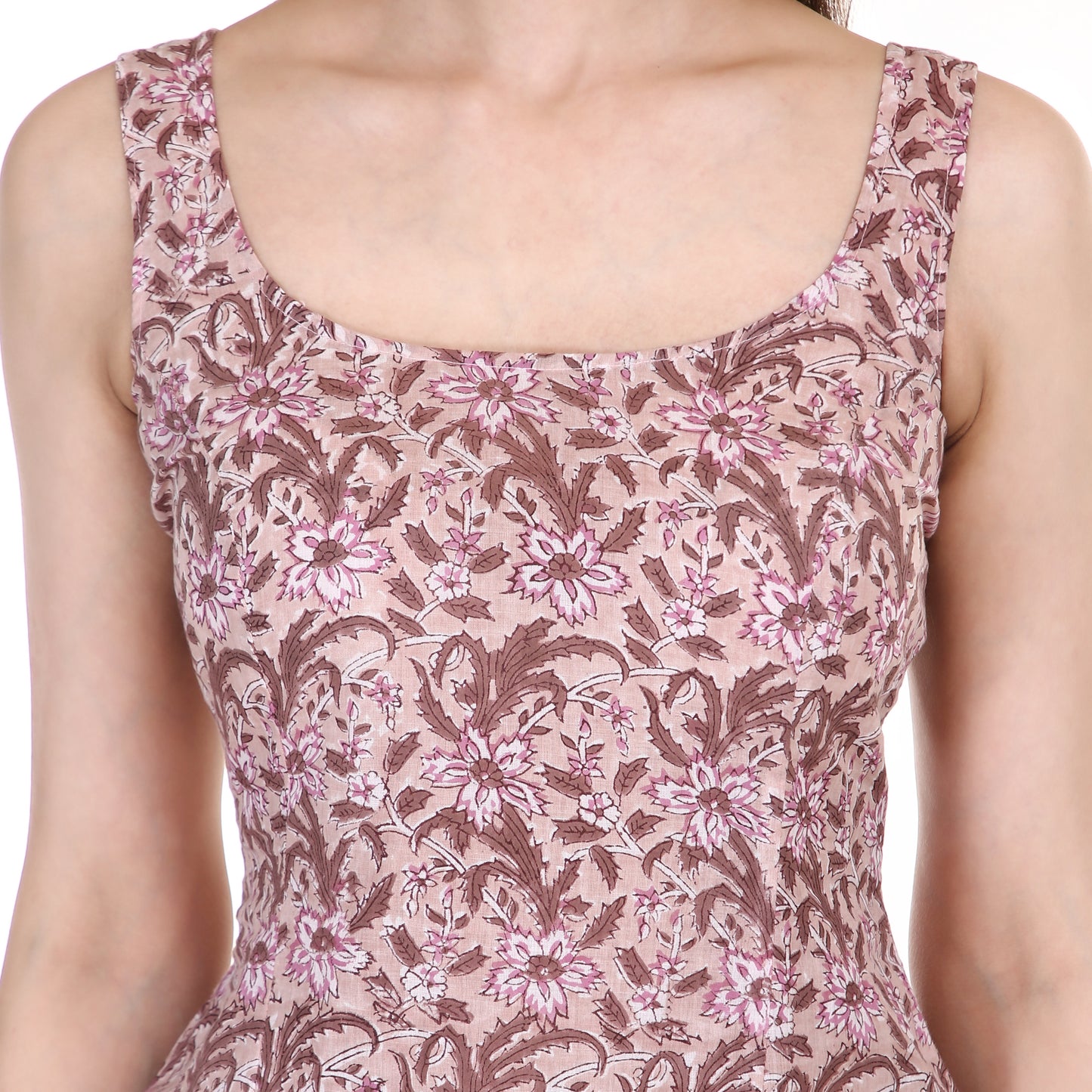 Pink Floral Handblock Printed Cotton Kurta – V Neck, 3/4 Sleeves