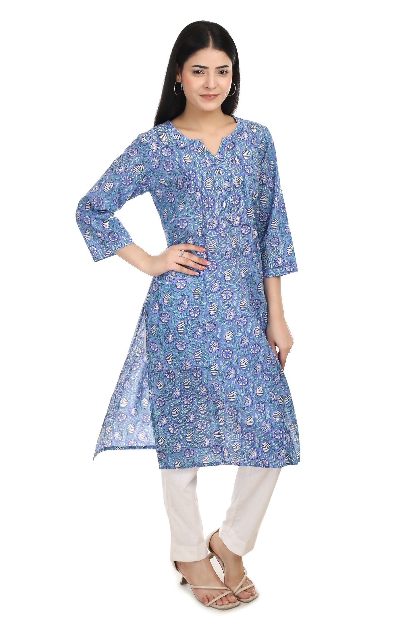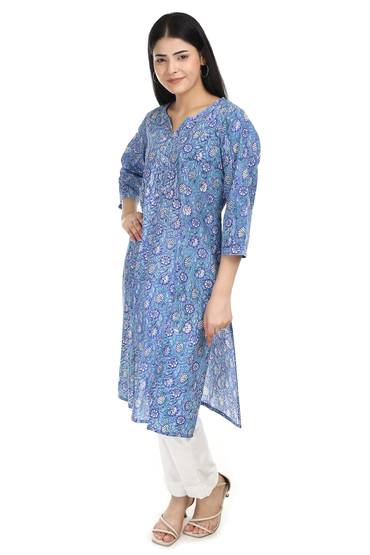 Pink Floral Handblock Printed Cotton Kurta – V Neck, 3/4 Sleeves
