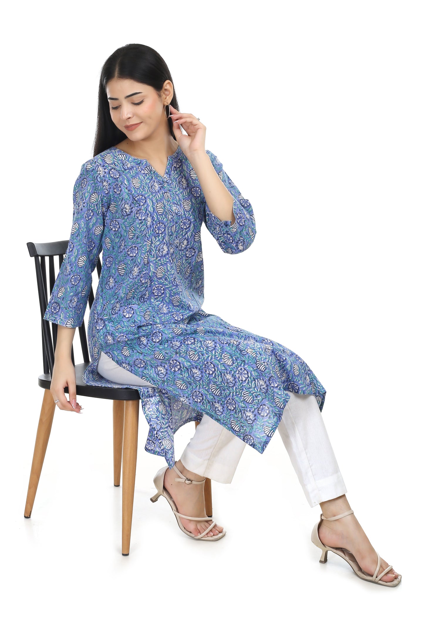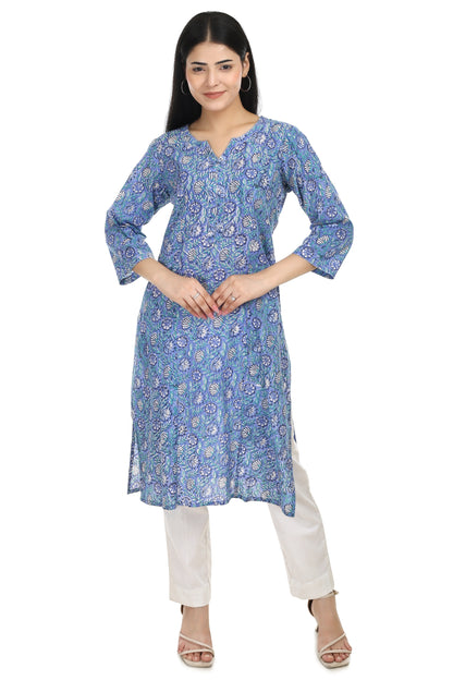Dhara, sky blue hand blocked straight fit kurta