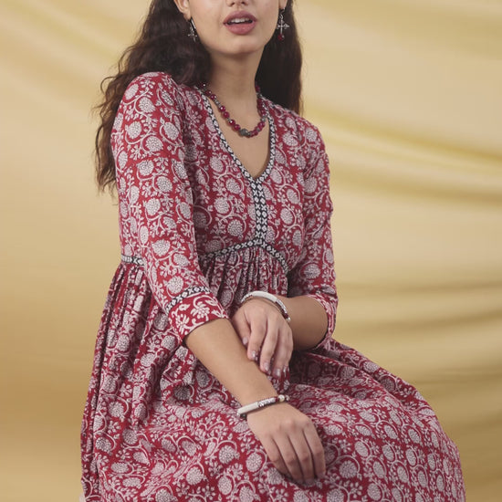 Elevate your everyday style with our Gulkaar Bagh dress, a beautiful expression of heritage and comfort. Crafted in breathable cotton and adorned with intricate Bagh block print, this kurta features a flattering empire waistline and elegant gathered detailing for a graceful fall. The V-neckline is highlighted with contrast printed piping, giving it a handcrafted charm.