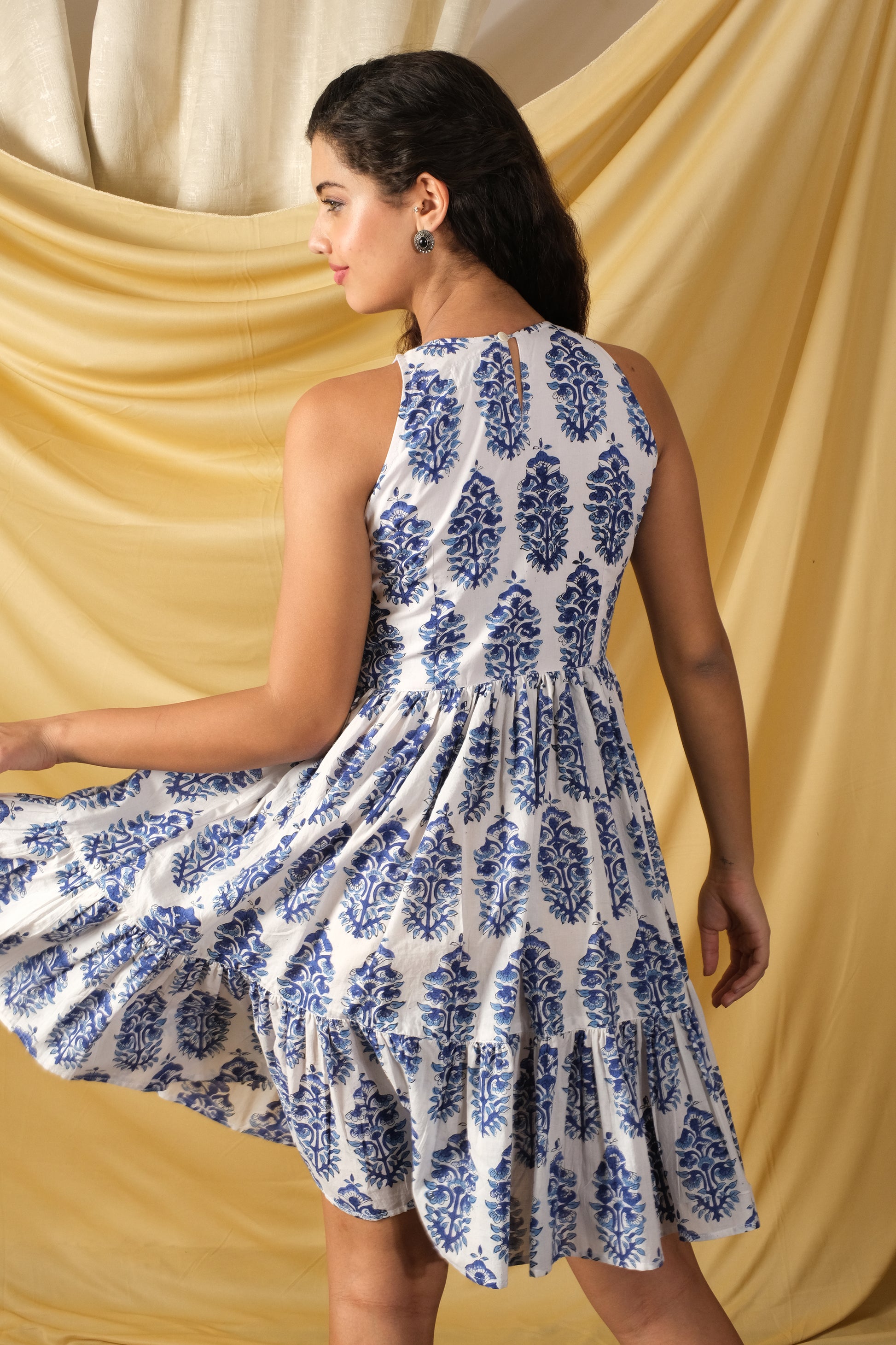 Bring freshness to your wardrobe with this Sanganeri Print Layered Cotton Dress. Crafted from soft, breathable cotton, it features a classic blue floral hand-block print that feels light and elegant. The tiered layers add a flowy charm, while the sleeveless design keeps it perfect for summer days and casual outings.