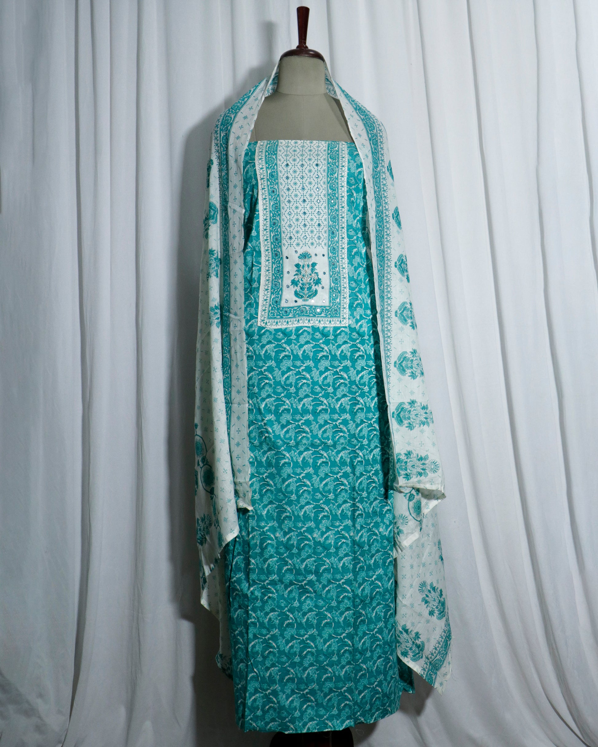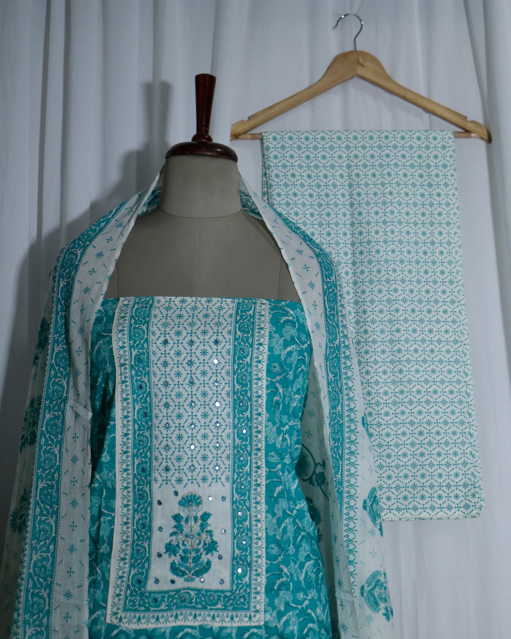 Printed Sea green Cotton suit set with Hand detailing on Neck Yoke