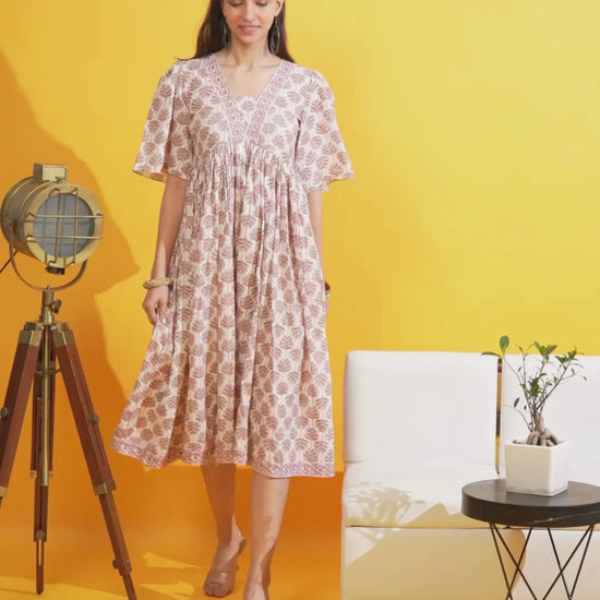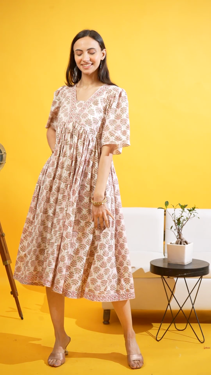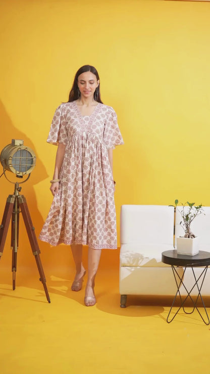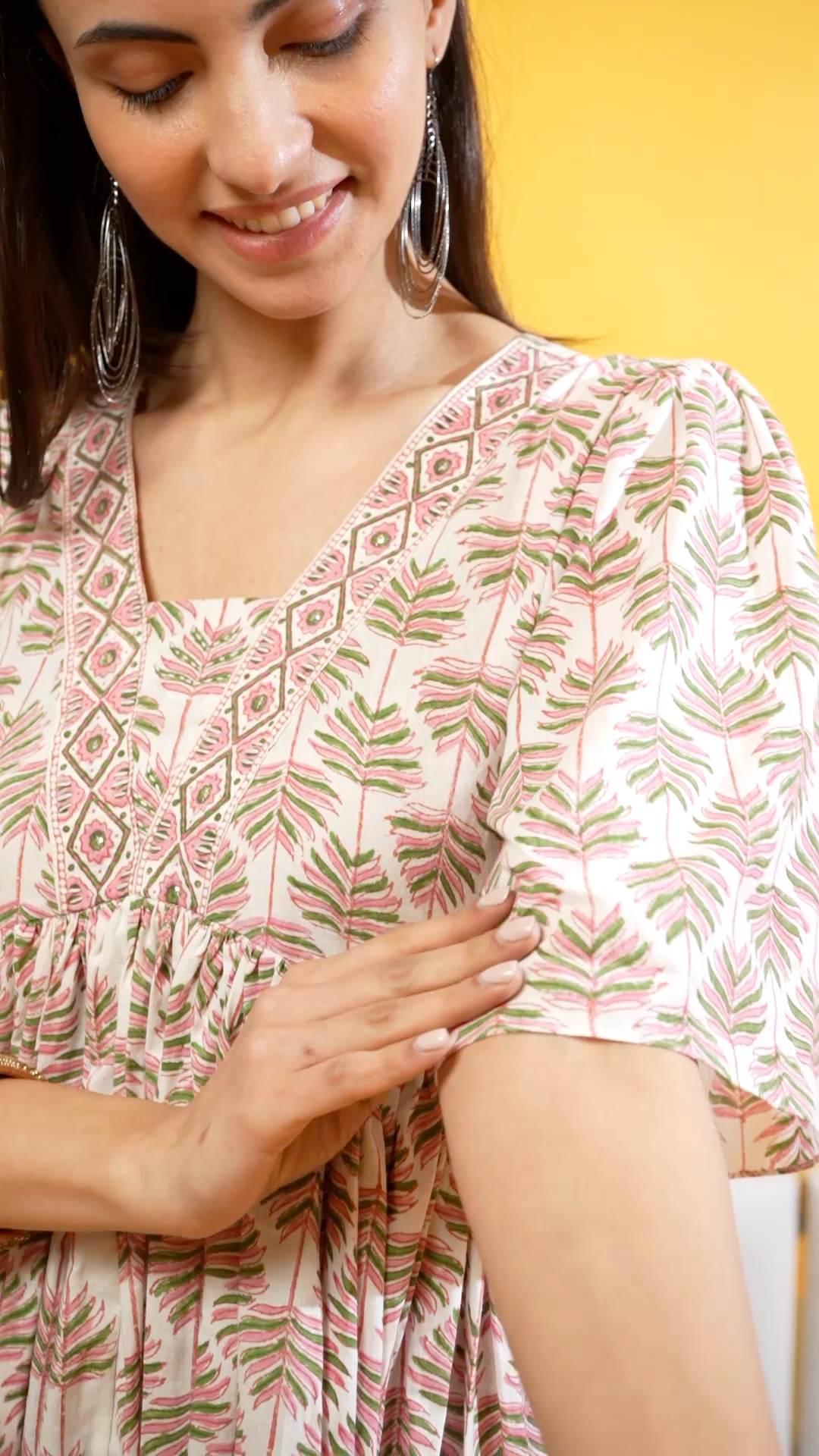 Pink Floral Handblock Printed Cotton Kurta – V Neck, 3/4 Sleeves