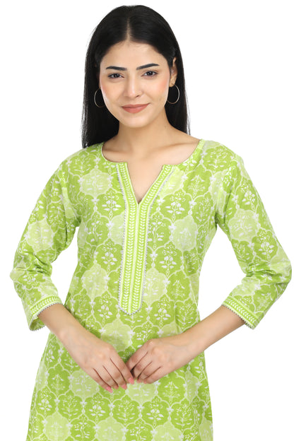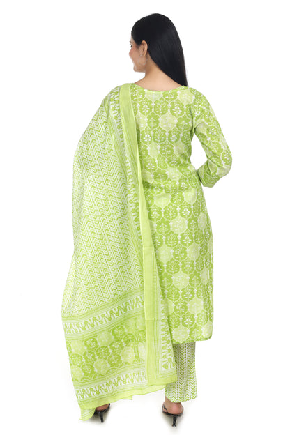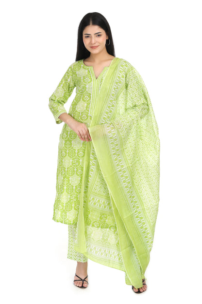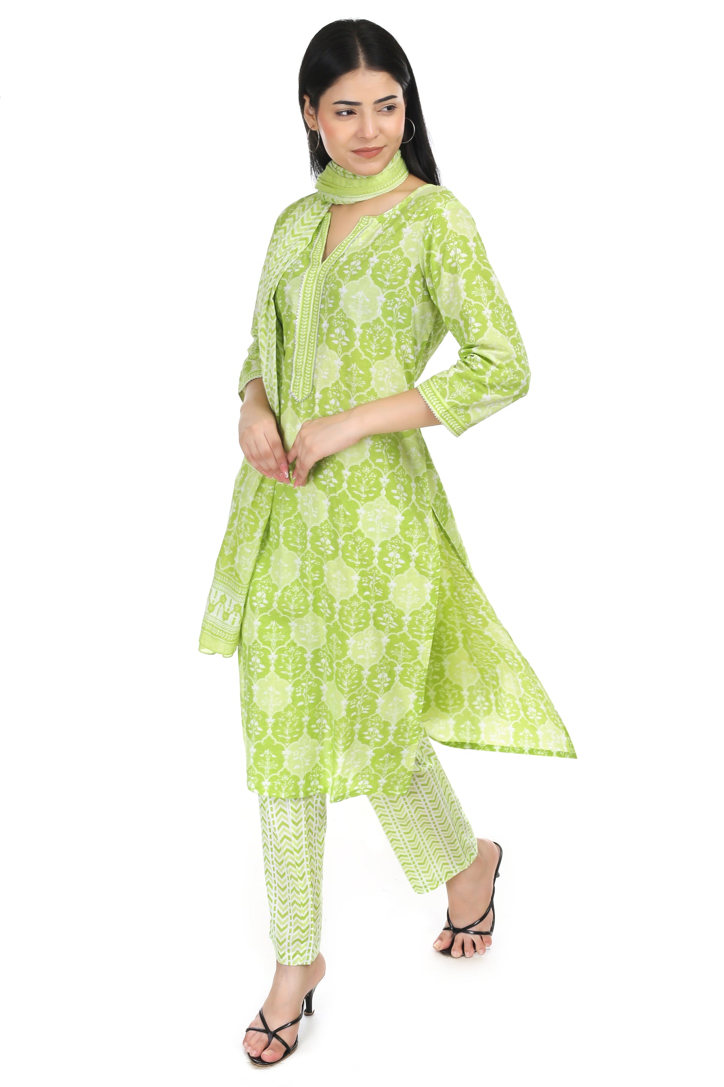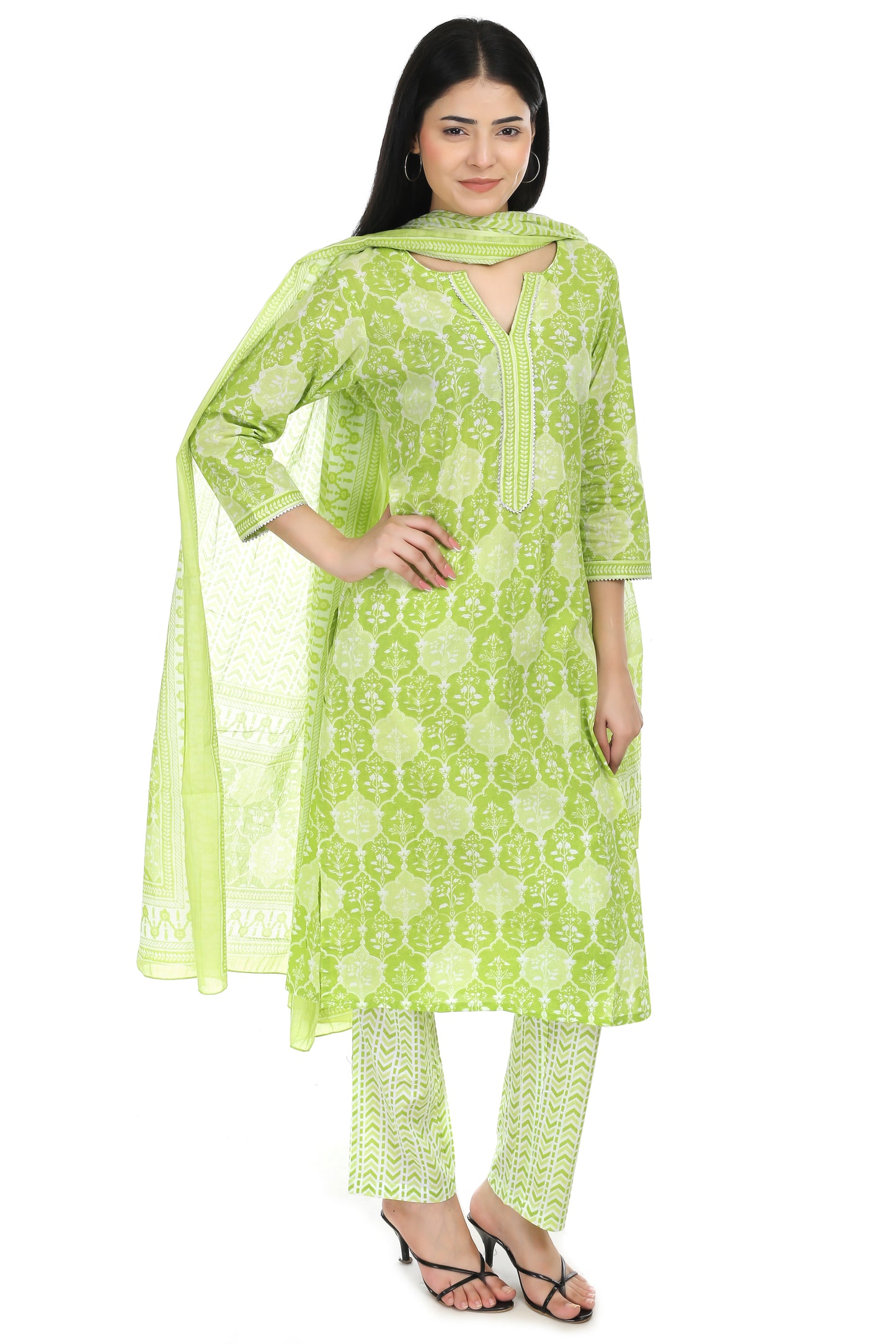 Light green, Jaipuri printed cotton suit set with mul-mul dupatta and cotton pant
