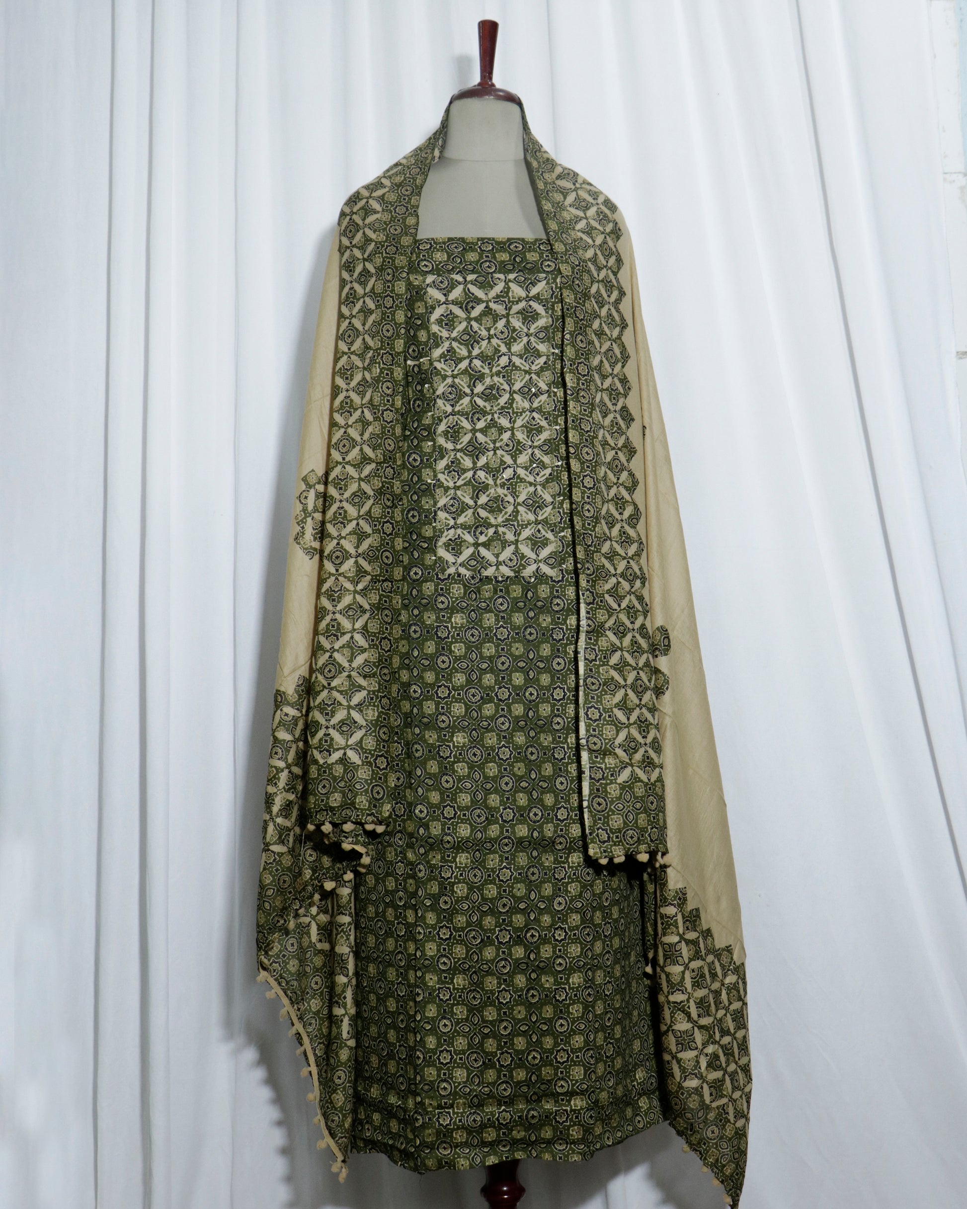 Experience timeless elegance with our authentic handcrafted unstitched suit collection from Chhajja-Art.