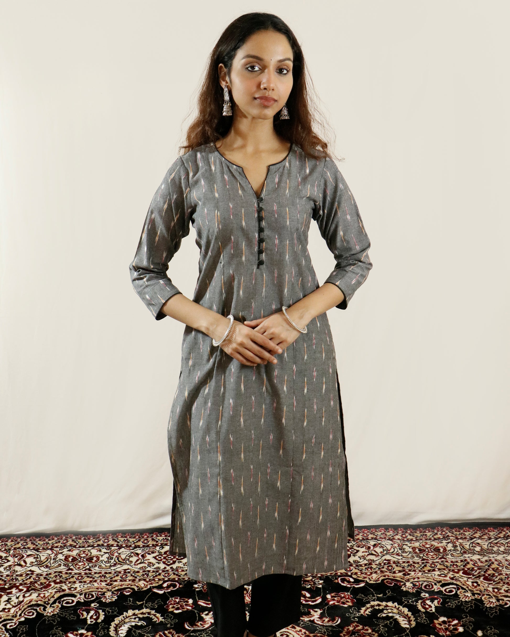 Step into effortless sophistication with the Grey Aura Ikat Suit Set, styled with a grey kurta, black pant, and a dual-tone dupatta — subtle, graceful, and timeless.