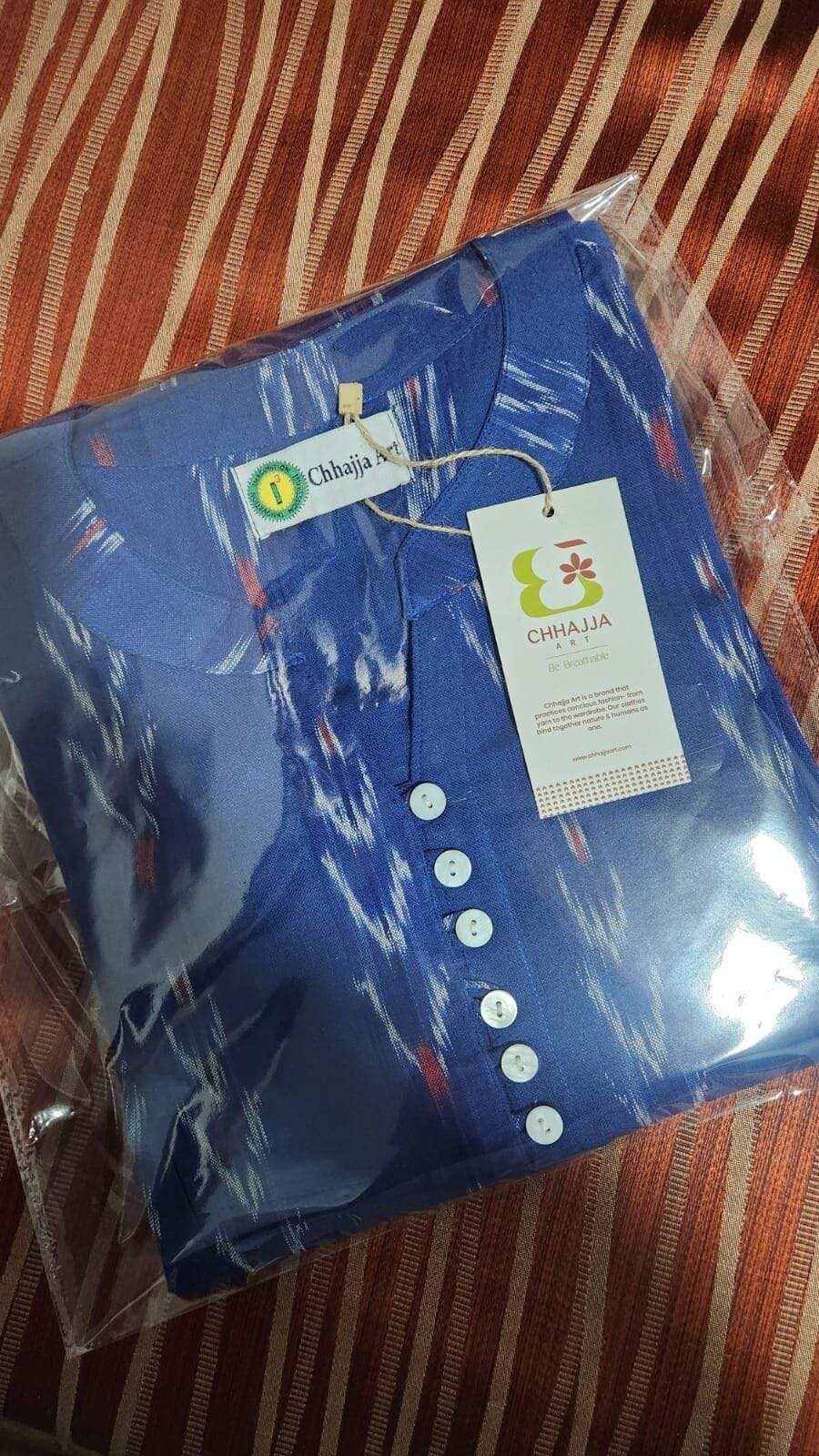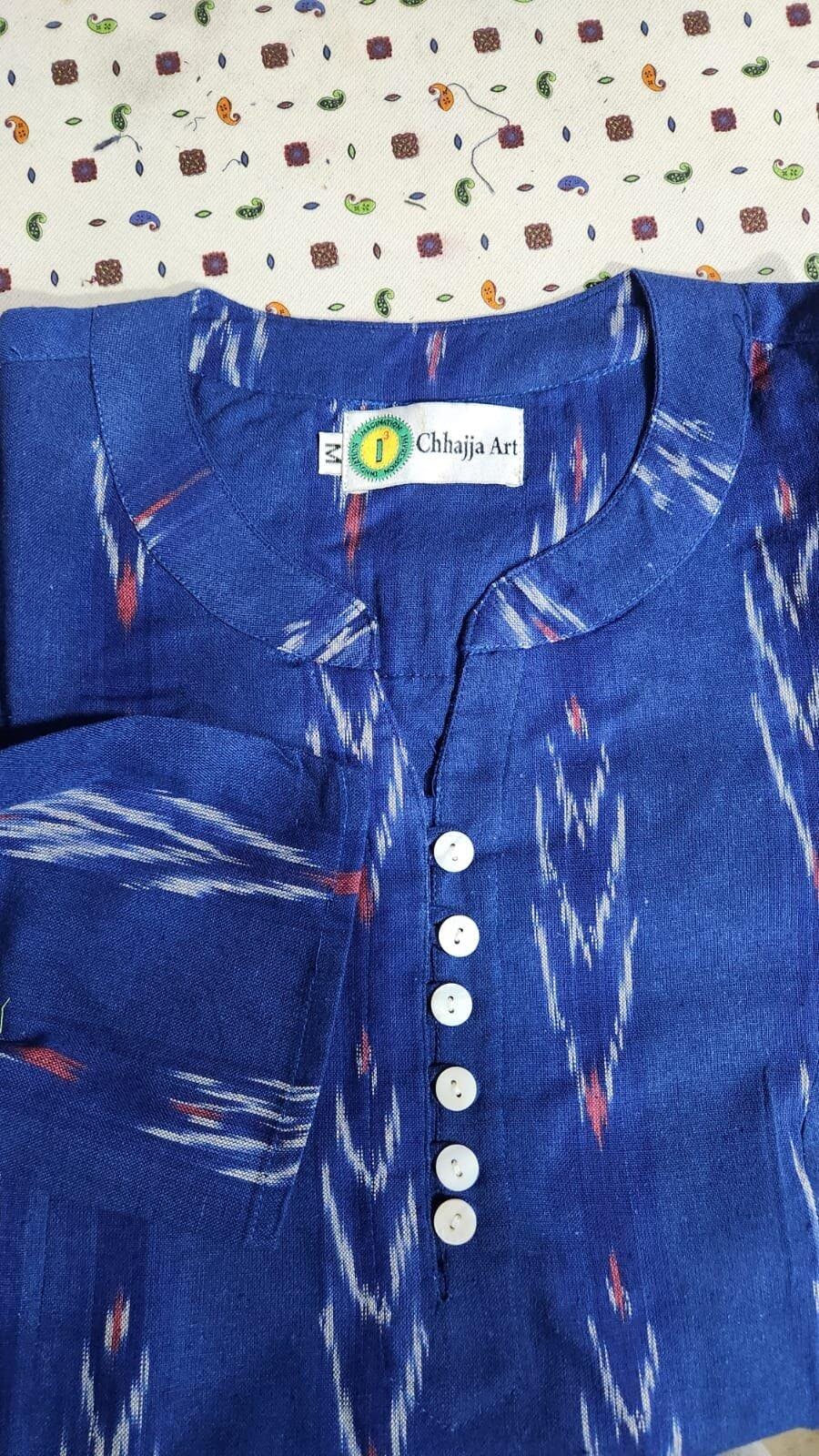 Elevate your everyday ethnic style with our handwoven Indigo Ikat Cotton Kurta. Crafted from soft and breathable pure cotton, this kurta showcases traditional Ikat weaving in timeless blue tones with subtle red and white accents. The A silhouette with a round collar neckline and button placket adds to its effortless charm, making it perfect for workwear, casual outings, or relaxed festive settings.