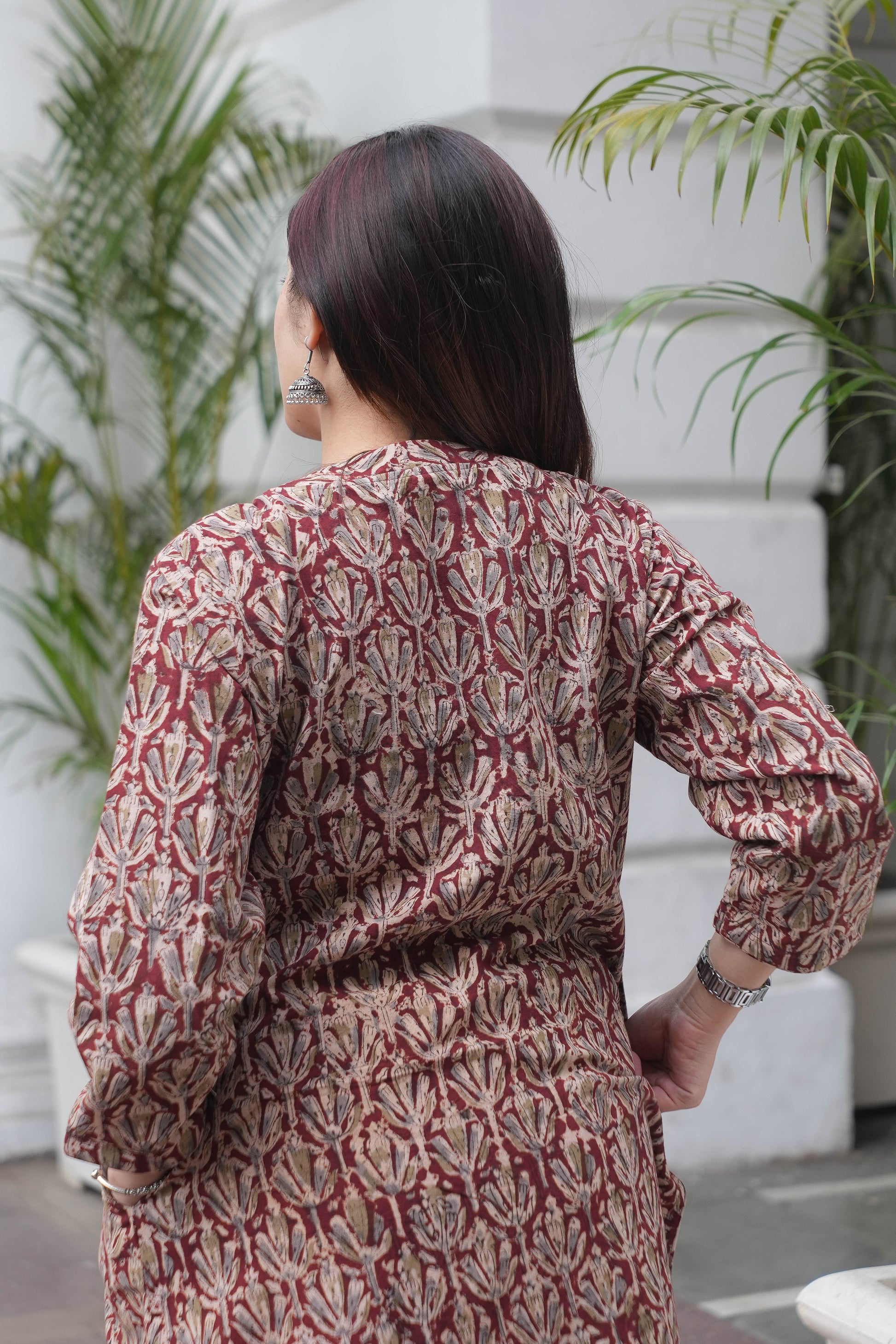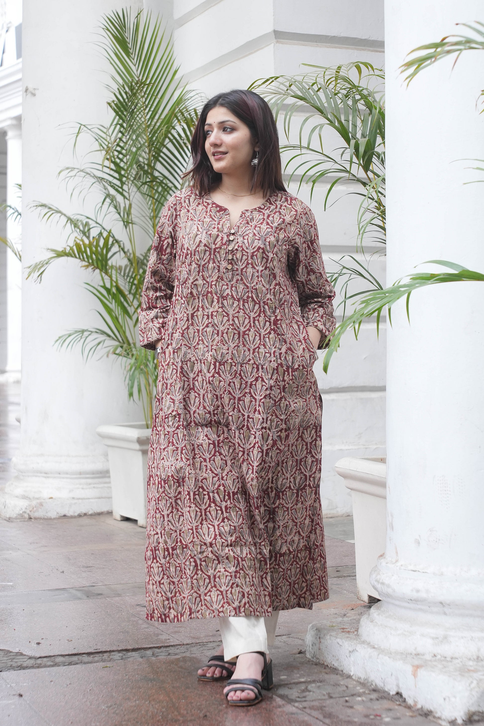 Rooted in tradition yet styled for modern comfort, this maroon Handblock Kalamkari A-Line Kurta is a timeless addition to your wardrobe. Crafted with intricate handblock prints, every motif tells a story of skilled artistry and heritage craftsmanship.