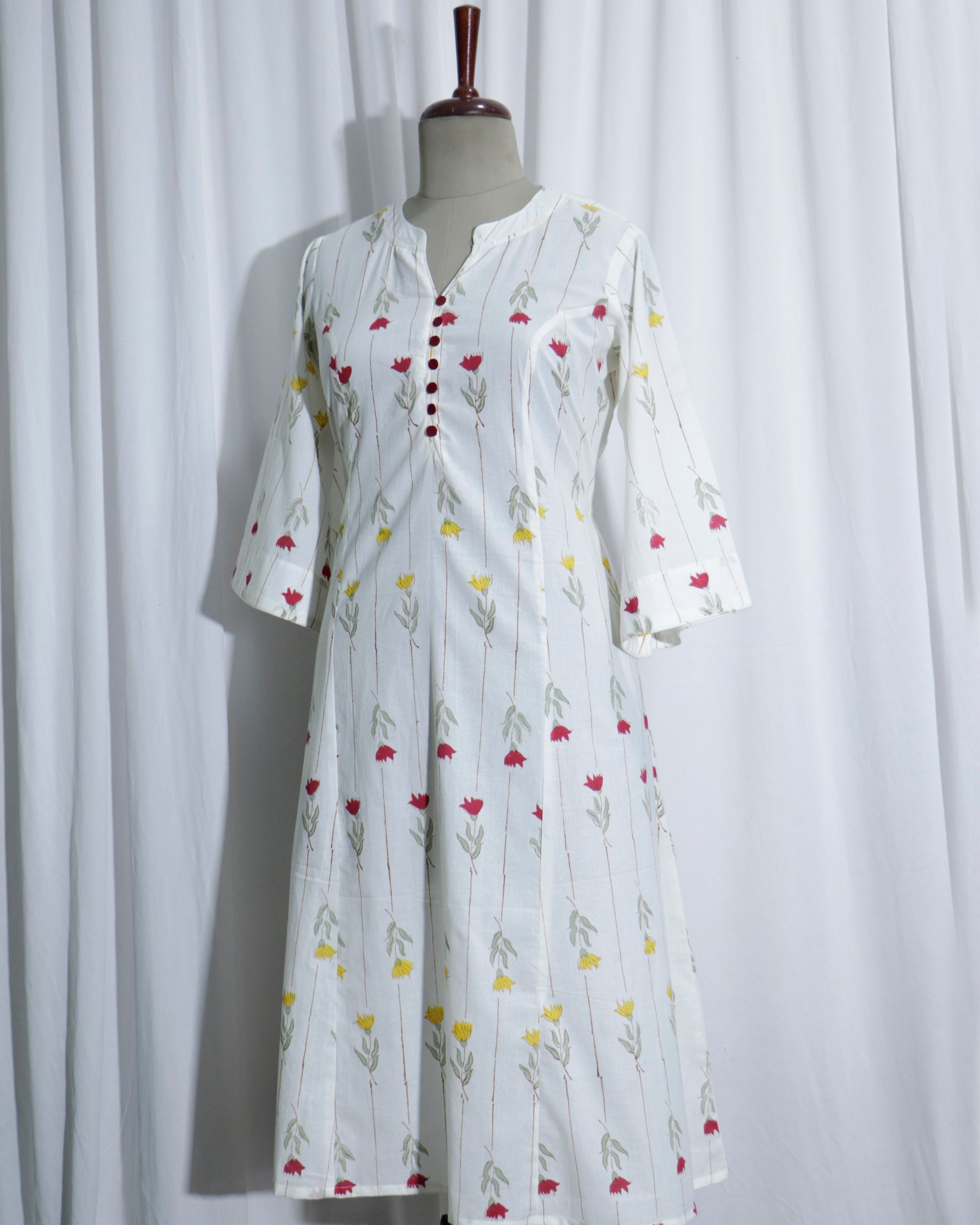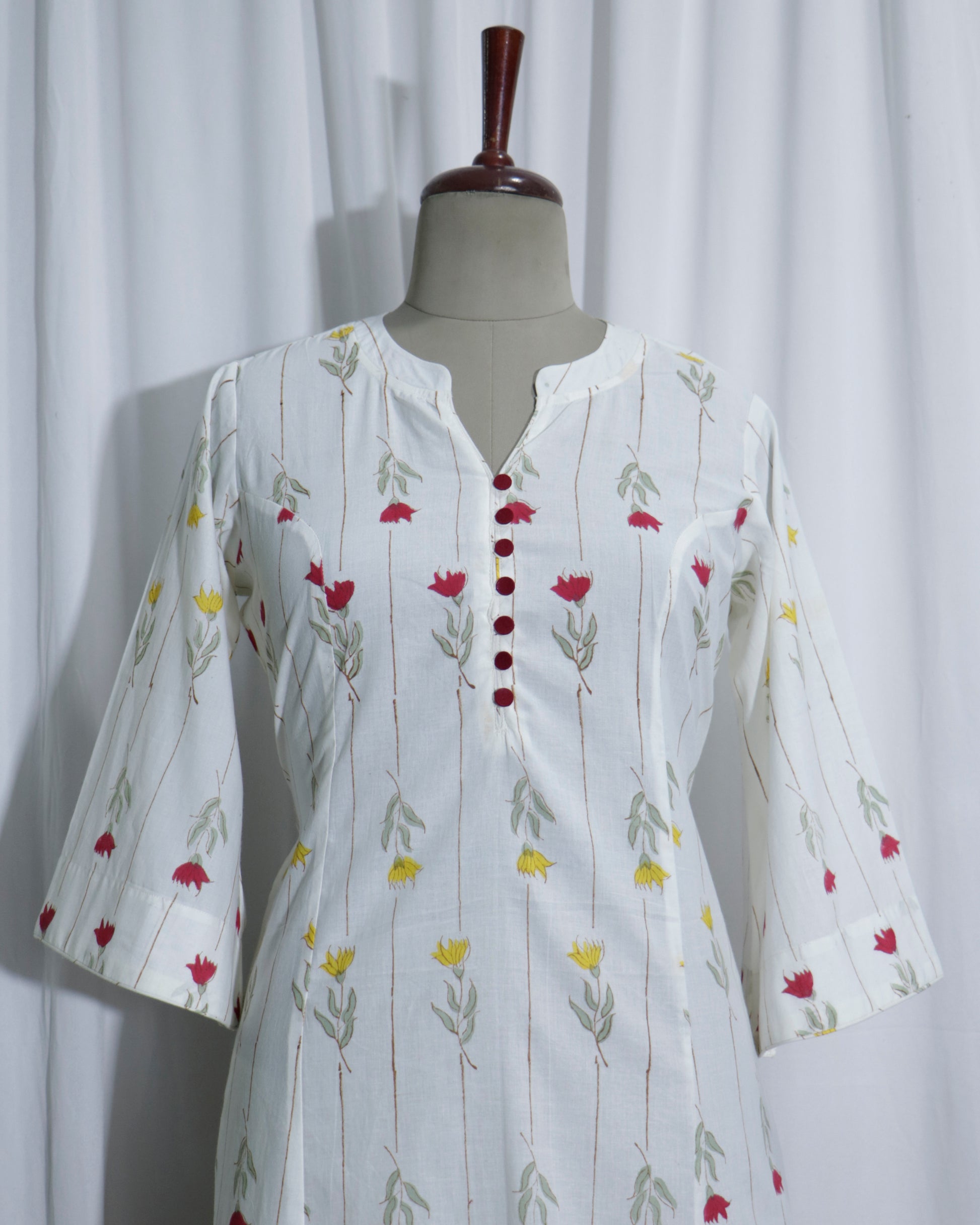 The red and yellow rose hand-block prints bring a fresh and lively touch to the pristine white base, making it ideal for both casual outings and festive occasions. Designed with a round V-neckline featuring a sitting collar, and adorned with potli buttons and loop details, this dress beautifully combines elegance with ethnic craftsmanship. The 3/4th sleeves complete the look, making it versatile for daily wear, office, or gatherings.