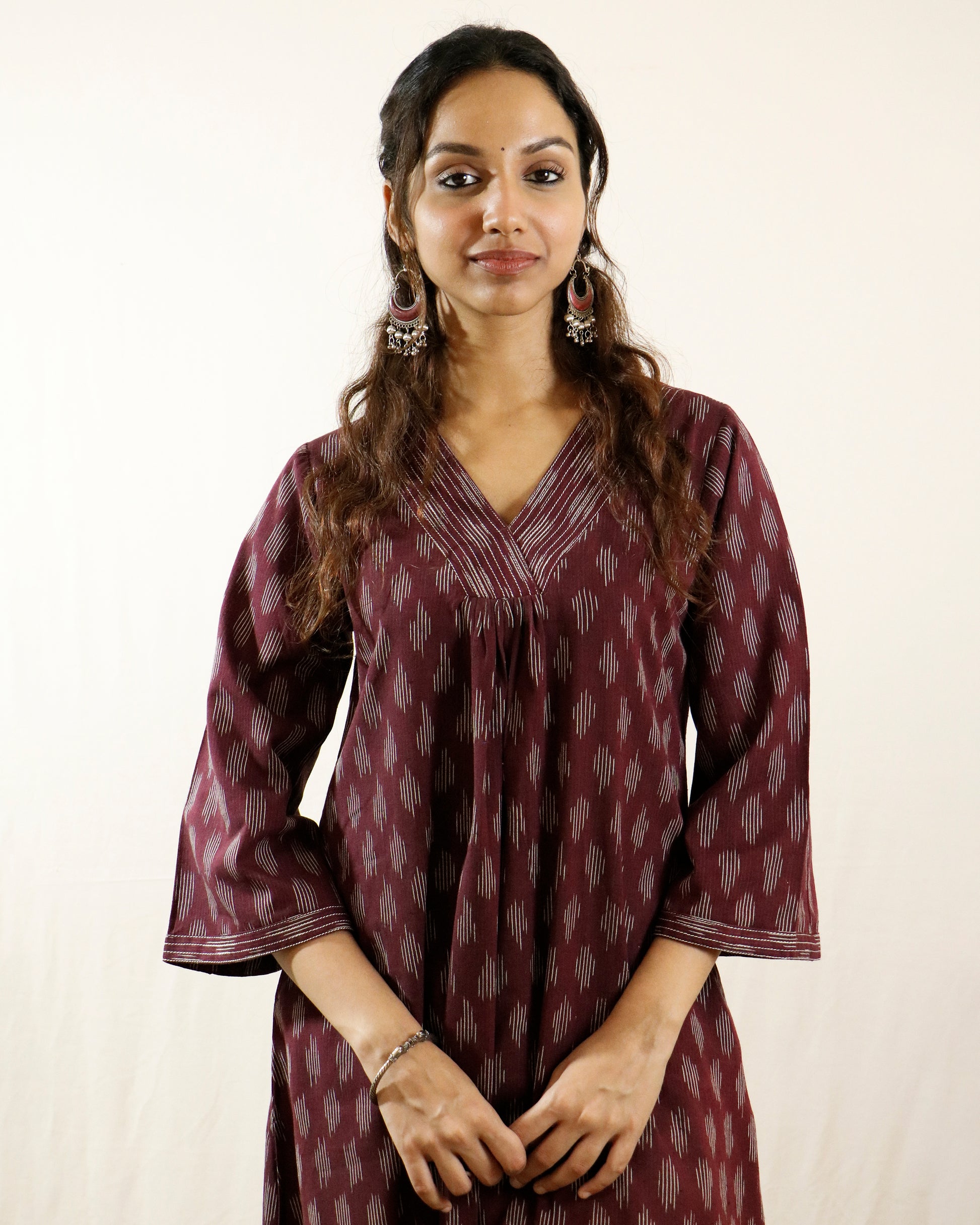 Wine Ikat Handwoven Cotton Kurta with Bell Sleeves